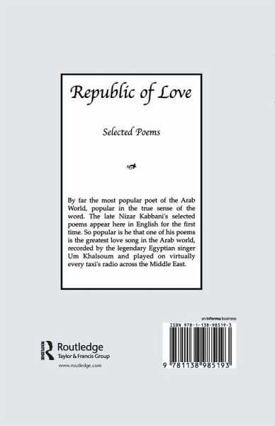 First published in 2005. Routledge is an imprint of Taylor & Francis, an informa company. By far the most popular poet of the Arab Word, popular in the true sense of the word. The late Nizar Kabbani's selected poems appear here in English for the first time. So popular is he that one of his poems is the greatest love song in the Arab world, recorded by the legendary Egyptian singer Um Khalsoum and played on virtually every taxi's radius across the Middle East.