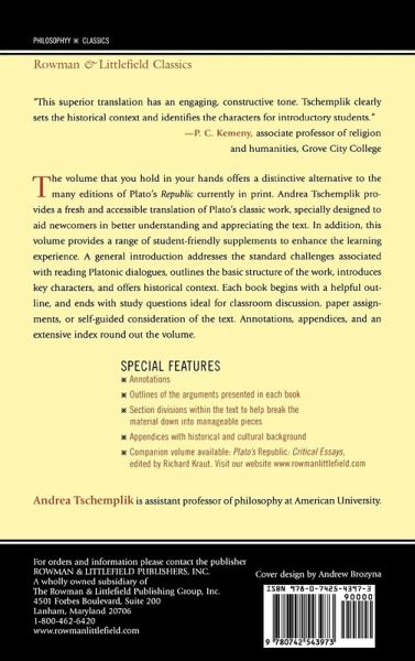 This superior translation has an engaging, constructive tone. For introductory students with little or no historical background with which to appreciate the nuances of Plato's Republic, Tschemplik clearly sets the historical context and identifies the characters. -- P.C. Kemeny, Associate Professor of Religion and Humanities, Grove City Associate Professor of Religion and Humanities, Grove City Associat