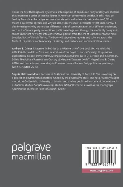 Introduction; Andrew S Crines and Sophia Hatzisavvidou.- 1 The Oratory of Dwight D Eisenhower; Mara Oliva.- 2 The Oratory of Barry Goldwater; Andrew Taylor.- 3 The Oratory of Richard Nixon; Peter Woodcock.- 4 The Oratory of Ronald Reagan; Matthew W. Klingbeil, John Clyde Russell, Mary E. Stuckey.- 5 The Oratory of Bob Dole; Jerry Miller.- 6 The Oratory of George H W Bush; Matthew Lakin.- 7 The Oratory of Dan Quayle; Timothy Heppell.- 8 The Oratory of Newt Gingrich; Gregory Koger.- 9 The Oratory of George W Bush; Jon Herbert.- 10 The Oratory of Condoleezza Rice; Clodagh Harrington.- 11 The Oratory of John McCain; Kenneth Fernandez.- 12 The Oratory of Sarah Palin; Sophia Hatzisavvidou.- 13 The Oratory of Donald J. Trump; Andrew S Crines and David P Dolowitz.- Conclusion; Sophia Hatzisavvidou and Andrew S Crines.