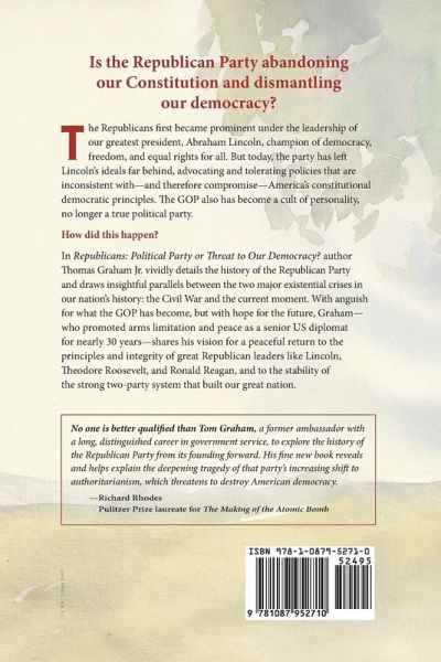 The Republicans first became prominent under the leadership of our greatest president, Abraham Lincoln, champion of democracy, freedom, and equal rights for all. But today, the party has left Lincoln's ideals far behind, advocating and tolerating policies that are inconsistent with-and therefore compromise-America's constitutional democratic principles. The GOP also has become a cult of personality, no longer a true political party. How did this happen? In Republicans: Political Party or Threat to Our Democracy? author Thomas Graham Jr. vividly details the history of the Republican Party and draws insightful parallels between the two major existential crises in our nation's history: the Civil War and the current moment. With anguish for what the GOP has become, but with hope for the future, Graham-who promoted arms limitation and peace as a senior US diplomat for nearly 30 years-shares his vision for a peaceful return to the principles and integrity of great Republican leaders like Lincoln, Theodore Roosevelt, and Ronald Reagan, and to the stability of the strong two-party system that built our great nation.