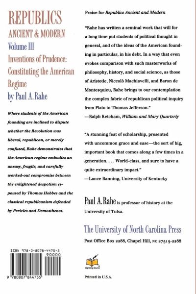 First published in 1992 and now available in paperback in three volumes, Paul Rahe's ambitious and provocative book bridges the gap between political theory, comparative history and government, and constitutional prudence. Rahe challenges prevailing interpretations of ancient Greek republicanism, early modern political thought, and the founding of the American republic. '[An] extraordinary book. . . . It is a great achievement and will stay as a landmark.'--The Spectator (London) 'This is the first, comprehensive study of republicanism, ancient and modern, written for our time.'--Harvey Mansfield, Harvard University 'A stunning feat of scholarship, presented with uncommon grace and ease--the sort of big, important book that comes along a few times in a generation. In an age of narrow specialists, it ranges through the centuries from classical Greece to the new American Republic, unfolding a coherent new interpretation of the rise of modern republicanism. . . . World-class, and sure to have a quite extraordinary impact.'--Lance Banning, University of Kentucky Volume I: The Ancien Regime in Classical Greece Where social scientists and many ancient historians tend to follow Max Weber or Karl Marx in asserting the centrality of status or class, Rahe's depiction of the illiberal, martial republics of classical Hellas vindicates Aristotle's insistence on the determinative influence of the political regime and brings back to life a world in which virtue is pursued as an end, politics is given primacy, and socioeconomic concerns are subordinated to grand political ambition. Volume II: New Modes and Orders in Early Modern Political Thought Where many intellectual historians discern a revival of the classical spirit in the political speculation of the age stretching from Machiavelli to Adam Smith, Rahe brings to light a self-conscious repudiation of the theory and practice of ancient self-government and an inclination to restrict the scope of politics, to place greater reliance on institutions than on virtuous restraint, and to give free rein to the human's capacities as a tool-making animal. Volume III: Inventions of Prudence: Constituting the American Regime Where students of the American founding are inclined to dispute whether the Revolution was liberal, republican, or merely confused, Rahe demonstrates that the American regime embodies an uneasy, fragile, and carefully worked-out compromise between the enlightened despotism espoused by Thomas Hobbes and the classical republicanism defended by Pericles and Demosthenes.