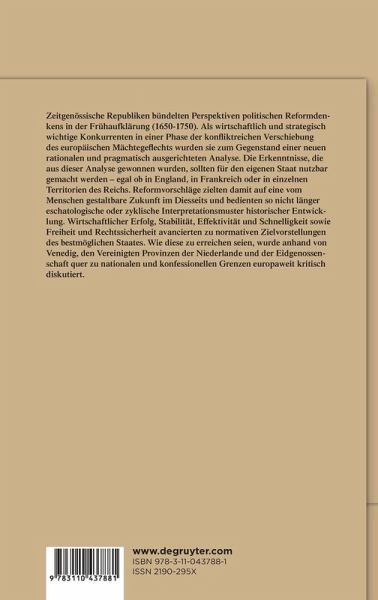 Zeitgenössische Republiken bündelten Perspektiven politischen Reformdenkens in der Frühaufklärung (1650-1750). Als wirtschaftlich und strategisch wichtige Konkurrenten in einer Phase der konfliktreichen Verschiebung des europäischen Mächtegeflechts wurden sie zum Gegenstand einer neuen rationalen und pragmatisch ausgerichteten Analyse. Die Erkenntnisse, die aus dieser Analyse gewonnen wurden, sollten für den eigenen Staat nutzbar gemacht werden - egal ob in England, in Frankreich oder in einzelnen Territorien des Reichs. Reformvorschläge zielten damit auf eine vom Menschen gestaltbare Zukunft im Diesseits und bedienten so nicht länger eschatologische oder zyklische Interpretationsmuster historischer Entwicklung. Wirtschaftlicher Erfolg, Stabilität, Effektivität und Schnelligkeit sowie Freiheit und Rechtssicherheit avancierten zu normativen Zielvorstellungen des bestmöglichen Staates. Wie diese zu erreichen seien, wurde anhand von Venedig, den Vereinigten Provinzen der Niederlande und der Eidgenossenschaft quer zu nationalen und konfessionellen Grenzen europaweit kritisch diskutiert.