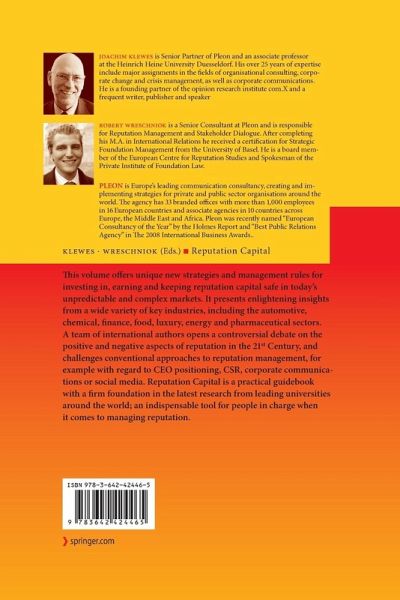 Reputation capital Building and maintaining trust in the 21st century.- I: Reputation in the 21st century - Good or evil?.- Trust and reputation in the age of globalisation.- Reputation or: How I learned to stop worrying and love the market.- II: The business case for reputation.- Recognition or rejection #x2013; How a company#x2019;s reputation influences stakeholder behaviour.- What#x2019;s measurable gets done #x2013; Communication controlling as a prerequisite for a successful reputation management.- The role of corporate and personal reputations in the global war for talent.- The CSR myth: true beauty comes from within.- The Brussels reputation story #x2013; the interplay of public affairs and reputation.- III: The 21st century of reputation crisis.- Managing reputational risk #x2013; A cindynic approach.- Managing reputational risk #x2013; Case studies.- Managing reputational risk #x2013; From theory to practice.- Reputation and regulation.- Measuring risks to reputation.- Crisismanagement in the media society #x2013; Communicative integrity as the key to safeguarding reputation in a crisis.- Getting the stain out of #x201C;sustainable brands#x201D;.- #x201C;Our reputation is at stake#x201D; #x2013; Corporate communications in the light of the global economic downturn.- IV: New perspectives for reputation management.- Community reputation communicates change to the world.- EU accession: Turkey#x2019;s reputation on its journey towards EU membership.- Consistency: a proven reputation strategy. How companies can optimise their message.- The Agora of the 21st century: On the invention of many-to-one communication.- The leader#x2019;s role in managing reputation.- Coca-Cola Hellenic reputation case study.- Never underestimate the importance of details.- Is there no prescription? Reputation in the pharmaceutical industry.- V: Reputation strategies for the 21st century.- Who wants to be a millionaire? Investment strategies for reputation management in the 21st century.