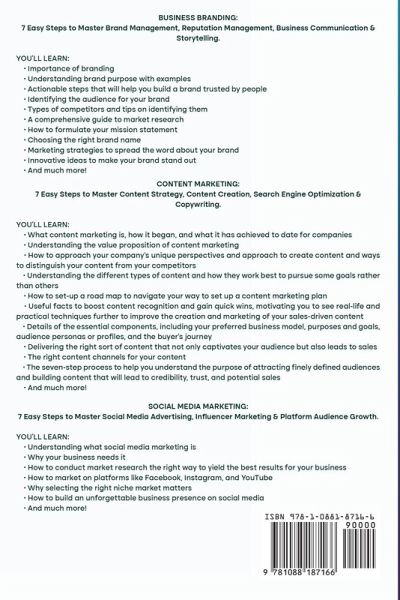 Reputation Management - 3 Manuscripts in 1 Book, Including: Business Branding, Social Media Marketing and Content Marketing. 1) BUSINESS BRANDING: 7 Easy Steps to Master Brand Management, Reputation Management, Business Communication & Storytelling. YOU'LL LEARN:Importance of branding Understanding brand purpose with examples Actionable steps that will help you build a brand trusted by people Identifying the audience for your brand Types of competitors and tips on identifying them A comprehensive guide to market research How to formulate your mission statement Choosing the right brand name Marketing strategies to spread the word about your brand Innovative ideas to make your brand stand out And much more! 2) SOCIAL MEDIA MARKETING: 7 Easy Steps to Master Social Media Advertising, Influencer Marketing & Platform Audience Growth. YOU'LL LEARN:Understanding what social media marketing is Why your business needs it How to conduct market research the right way to yield the best results for your business How to market on platforms like Facebook, Instagram, and YouTube Why selecting the right niche market matters How to build an unforgettable business presence on social media And much more! 3) CONTENT MARKETING: 7 Easy Steps to Master Content Strategy, Content Creation, Search Engine Optimization & Copywriting. YOU'LL LEARN:What content marketing is, how it began, and what it has achieved to date for companies Understanding the value proposition of content marketing How to approach your company's unique perspectives and approach to create content and ways to distinguish your content from your competitors Understanding the different types of content and how they work best to pursue some goals rather than others How to set-up a road map to navigate your way to set up a content marketing plan Useful facts to boost content recognition and gain quick wins, motivating you to see real-life and practical techniques further to improve the creation and marketing of your sales-driven content Details of the essential components, including your preferred business model, purposes and goals, audience personas or profiles, and the buyer's journey Delivering the right sort of content that not only captivates your audience but also leads to sales The right content channels for your content The seven-step process to help you understand the purpose of attracting finely defined audiences and building content that will lead to credibility, trust, and potential sales And much more!