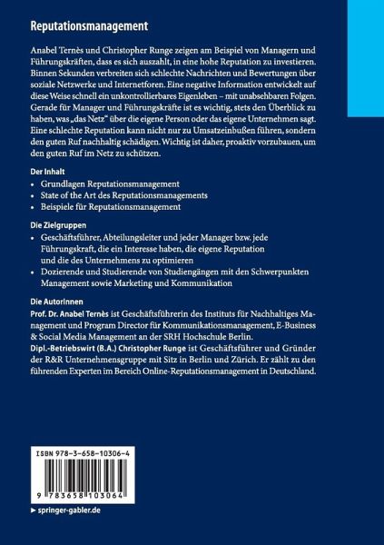 Anabel Ternès und Christopher Runge zeigen am Beispiel von Managern und Führungskräften, dass es sich auszahlt, in eine hohe Reputation zu investieren. Binnen Sekunden verbreiten sich schlechte Nachrichten und Bewertungen über soziale Netzwerke und Internetforen. Eine negative Information entwickelt auf diese Weise schnell ein unkontrollierbares Eigenleben - mit unabsehbaren Folgen. Gerade für Manager und Führungskräfte ist es wichtig, stets den Überblick zu haben, was "das Netz" über die eigene Person oder das eigene Unternehmen sagt. Eine schlechte Reputation kann nicht nur zu Umsatzeinbußen führen, sondern den guten Ruf nachhaltig schädigen. Wichtig ist daher, proaktiv vorzubauen, um den guten Ruf im Netz zu schützen.