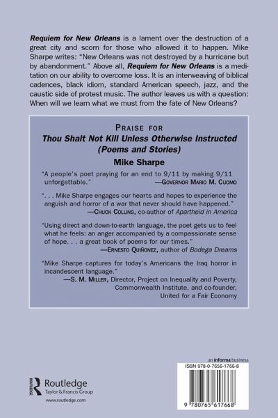 "Requiem for New Orleans" is a lament for the destruction of a great city and scorn for those who allowed it to happen. Mike Sharpe writes: "New Orleans was not destroyed by a hurricane but by abandonment." Above all, "Requiem for New Orleans" is a meditation on our ability to overcome loss. It is an interweaving of biblical cadences, black idiom, standard American speech, jazz, and the caustic side of protest music. The author leaves us with a question: when will we learn what we must from the fate of New Orleans?