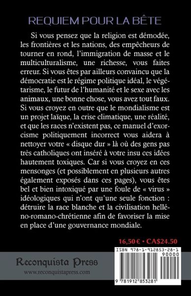 Si vous pensez que la religion est démodée, les frontières et les nations, des empêcheurs de tourner en rond, l'immigration de masse et le multiculturalisme, une richesse, vous faites erreur. Si vous êtes par ailleurs convaincu que la démocratie est le régime politique idéal, le végétarisme, le futur de l'humanité et le sexe avec les animaux, une bonne chose, vous avez tout faux. Si vous croyez en outre que le mondialisme est un projet laïque, la crise climatique, une réalité, et que les races n'existent pas, ce manuel d'exorcisme politiquement incorrect vous aidera à nettoyer votre disque dur là où des gens pas très catholiques ont inséré à votre insu ces idées hautement toxiques. Car si vous croyez en ces mensonges (et possiblement en plusieurs autres également exposés dans ces pages), vous êtes bel et bien intoxiqué par une foule de virus idéologiques qui n'ont qu'une seule fonction : détruire la race blanche et la civilisation helléno-romano-chrétienne afin de favoriser la mise en place d'une gouvernance mondiale.