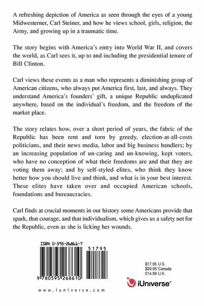A refreshing depiction of America as seen through the eyes of a young Midwesterner, Carl Steiner, and how he views school, girls, religion, the Army, and growing up in a traumatic time.