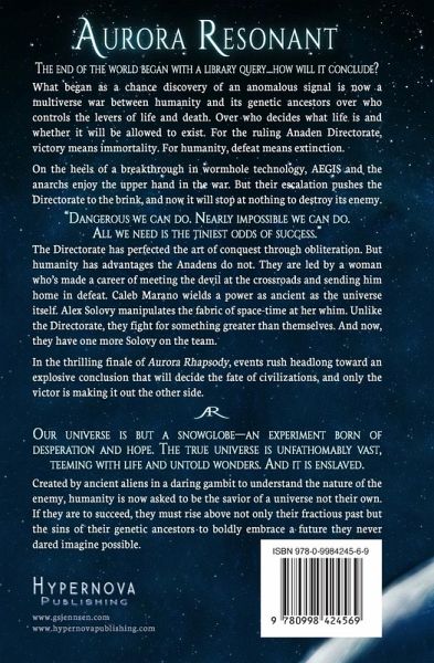 The end of the world began with a library query…how will it conclude? What began as a chance discovery of an anomalous signal is now a multiverse war between humanity and its genetic ancestors over who controls the levers of life and death. Over who decides what life is and whether it will be allowed to exist. For the ruling Anaden Directorate, victory means immortality. For humanity, defeat means extinction. On the heels of a breakthrough in wormhole technology, AEGIS and the anarchs enjoy the upper hand in the war. But their escalation pushes the Directorate to the brink, and now it will stop at nothing to destroy its enemy. "Dangerous we can do. Nearly impossible we can do. All we need is the tiniest odds of success." The Directorate has perfected the art of conquest through obliteration. But humanity has advantages the Anadens do not. They are led by a woman who’s made a career of meeting the devil at the crossroads and sending him home in defeat. Caleb Marano wields a power as ancient as the universe itself. Alex Solovy manipulates the fabric of space-time at her whim. Unlike the Directorate, they fight for something greater than themselves. And now, they have one more Solovy on the team. In the thrilling finale of Aurora Rhapsody, events rush headlong toward an explosive conclusion that will decide the fate of civilizations, and only the victor is making it out the other side. * Our universe is but a snowglobe—an experiment born of desperation and hope. The true universe is unfathomably vast, teeming with life and untold wonders. And it is enslaved. Created by ancient aliens in a daring gambit to understand the nature of the enemy, humanity is now asked to be the savior of a universe not their own. If they are to succeed, they must rise above not only their fractious past but the sins of their genetic ancestors to boldly embrace a future they never dared imagine possible.