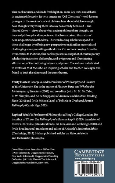 This book revisits, and sheds fresh light on, some key texts and debates in ancient philosophy. Its twin targets are 'Old Chestnuts' - well-known passages in the works of ancient philosophers about which one might have thought everything there is to say has already been said - and 'Sacred Cows' - views about what ancient philosophers thought, on issues of philosophical importance, that have attained the status of near-unquestioned orthodoxy. Thirteen leading scholars respond to these challenges by offering new perspectives on familiar material and challenging some prevailing orthodoxies. On authors ranging from the Presocratics to Plotinus, the book represents a snapshot of contemporary scholarship in ancient philosophy, and a vigorous and illuminating affirmation of its continuing interest and power. The volume is dedicated to Professor M. M. McCabe, an inspiring scholar and teacher, colleague and friend to both the editors and the contributors.