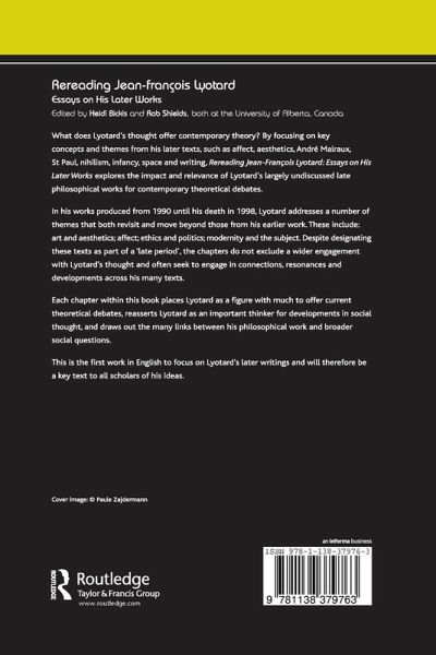 What does Lyotard's thought offer contemporary theory? By focusing on key concepts and themes from his later texts, such as affect, aesthetics, Andre Malraux, St Paul, nihilism, infancy, space and writing, Rereading Jean-François Lyotard: Essays on His Later Works explores the impact and relevance of Lyotard's largely undiscussed late philosophical works for contemporary theoretical debates. In his works produced from 1990 until his death in 1998, Lyotard addresses a number of themes that both revisit and move beyond those from his earlier work. These include: art and aesthetics; affect; ethics and politics; modernity and the subject. Despite designating these texts as part of a 'late period', the chapters do not exclude a wider engagement with Lyotard's thought and often seek to engage in connections, resonances and developments across his many texts. Each chapter within this book places Lyotard as a figure with much to offer current theoretical debates, reasserts Lyotard as an important thinker for developments in social thought, and draws out the many links between his philosophical work and broader social questions. This is the first work in English to focus on Lyotard's later writings and will therefore be a key text to all scholars of his ideas.