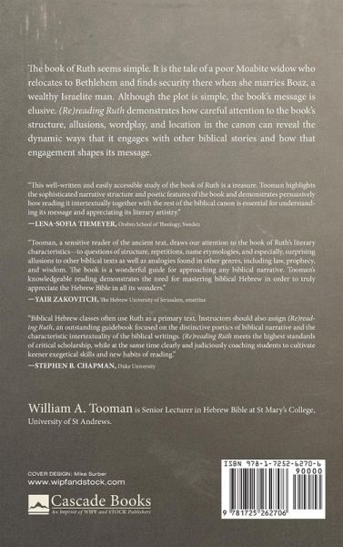 The book of Ruth seems simple. It is the tale of a poor Moabite widow who relocates to Bethlehem and finds security there when she marries Boaz, a wealthy Israelite man. Although the plot is simple, the book's message is elusive. Re(reading Ruth) demonstrates how careful attention to the book's structure, allusions, wordplay, and location in the canon can reveal the dynamic ways that it engages with other biblical stories and how that engagement shapes its message.