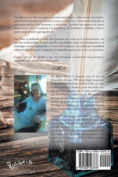Este libro es un libro de prosa y poemas románticos, todos no son personales, pero si son inspirados en el amor, en ese en el que creo. Otros están dedicados a mis cuatro nietos, a mi hermana y a mis viejos. También hay algunos de temas importantes como el maltrato a la naturaleza, el Alzheimer y también a Dios a quien tengo mucho que agradecer. Este libro va dedicado a todas esas personas que creen en el romanticismo, ese que hoy se ha perdido. Es para aquellos que todavía creen en las mariposas en el estómago, esos que no conciben el amor sin la ternura y no confunden sexualidad con sensualidad los que no pueden ir separados, pues si no es así, no será amor. Espero que sea de agrado y que nos volvamos a enamorar con poemas y romanticismo, ¡Ayúdenme a rescatarlo!