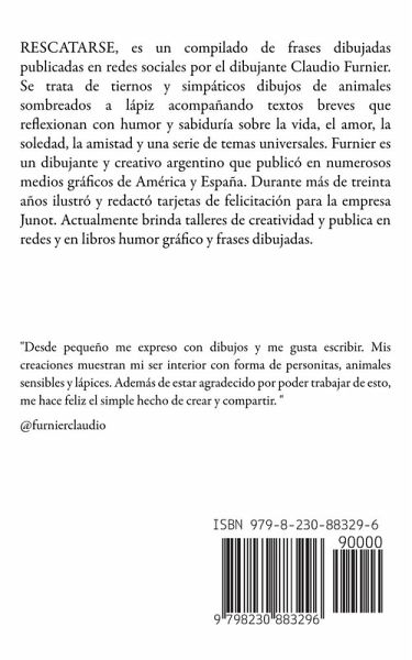RESCATARSE, es un compilado de frases dibujadas publicadas en redes sociales por el dibujante Claudio Furnier, bajo el título de Agenda dibujada. Se trata de tiernos y simpáticos dibujos de animales sombreados a lápiz acompañando textos breves que reflexionan con humor y sabiduría sobre la vida, el amor, la soledad, la amistad y una serie de temas universales. Furnier es un dibujante y creativo argentino que publicó en numerosos medios gráficos de América y España. Durante más de treinta años ilustró y redactó tarjetas de felicitación para la empresa Junot. Actualmente brinda talleres de creatividad y publica en redes y en libros humor gráfico y frases dibujadas.