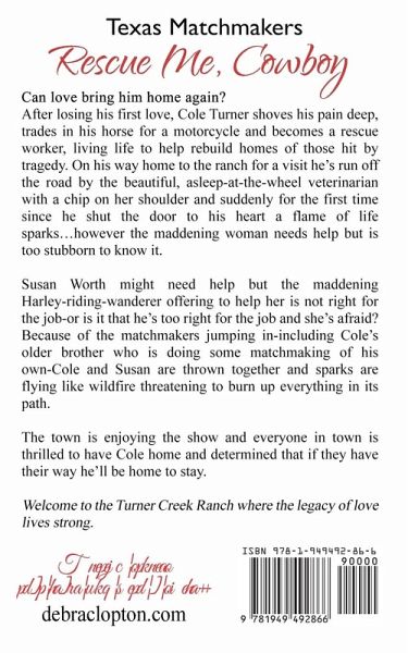 Can love bring him home again? After losing his first love, Cole Turner shoves his pain deep, trades in his horse for a motorcycle and becomes a rescue worker, living life to help rebuild homes of those hit by tragedy. On his way home to the ranch for a visit he's run off the road by the beautiful, asleep-at-the-wheel veterinarian with a chip on her shoulder and suddenly for the first time since he shut the door to his heart a flame of life sparks…however the maddening woman needs help but is too stubborn to know it. Susan Worth might need help but the maddening Harley-riding-wanderer offering to help her is not right for the job-or is it that he's too right for the job and she's afraid? Because of the matchmakers jumping in-including Cole's older brother who is doing some matchmaking of his own-Cole and Susan are thrown together and sparks are flying like wildfire threatening to burn up everything in its path. The town is enjoying the show and everyone in town is thrilled to have Cole home and determined that if they have their way he'll be home to stay. Welcome to the Turner Creek Ranch where the legacy of love lives strong.