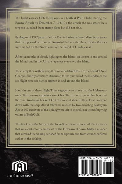 This book is written about a Light Cruiser that was heavily involved in the Solomon's in the far Pacific. It seemed that she was indestructable and possessed of a charmed life. Time after time when trouble struck and it seemed that disaster lurked in the wings the angel of death passed over her. But those who repeatedly tempt fate are destined to reap a bitter harvest. It happened after the Enemy had been driven off the Island of Guadalcanal and had retired to the Island of New Georgia to make a desperate stand. But the United States Military Forces were not to be denied the Fruits of Final Victory. Fierce nocturnal Fights erupted at Night in the Sea around the Island of New Georgia. And it was on one of these terrible nights in a God Forsaken stretch of Water the Natives called Kula Gulf that the Helena's charmed life came to an end. The first Torpedo tore off her bow; two more torpedoes broke her hull in two pieces and put her on the bottom. About 176 men perished in the sinking. Another 760 were cast into the sea. Two destroyer picked up about 500 of them and fled the scene to be out of reach of the Japanese dive bombers before dawn began to light up the eastern sky. This book is about the rescue of the remaining crew members who remained in the dark murky waters of Kula Gulf. These unfortunate men had no assurance that they would ever be rescued. Many of them spent what seemed to be endless hours tortured by thirst; plagued by the pain of burns and other injuries that exposed raw flesh to the Salt Water. It was a hellish situation if there ever was one. From time to time another and another gave up the fight to survive and sank below the sea to rise no more. Here they were cast into the dark waters right at the enemies doorstep. But their salvation was waiting in the wings as the valor and devotion to their fellow comrades decided the issue. Like the Cavalry of Old charging across the prairie with the Bugles Shrill notes blowing the Charge the remaining destoyers at Guadalcanal came to their rescue. This in the final analysis is the incredible Story of that Valiant Rescue.