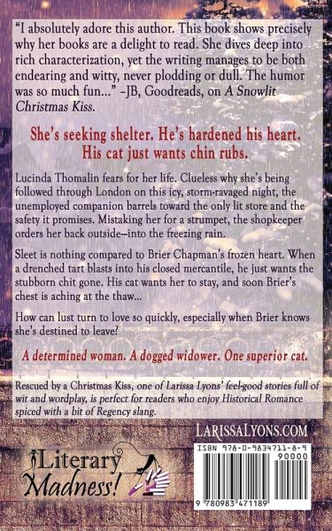 If you like feel-good stories full of wit and wordplay, Larissa Lyons' heartfelt holiday Christmas Kisses are what you want in your stocking!She's seeking shelter. He's hardened his heart. His cat just wants chin rubs. Lucinda Thomalin fears for her life. Clueless why she's being followed through London on this icy, storm-ravaged night, the unemployed companion barrels toward the only lit store and the safety it promises. Mistaking her for a strumpet, the shopkeeper orders her back outside-into the freezing rain. Sleet is nothing compared to Brier Chapman's frozen heart. When a drenched tart blasts into his closed mercantile, he just wants the stubborn chit gone. His cat wants her to stay, and soon Brier's chest is aching at the thaw... How can lust turn to love so quickly, especially when Brier knows she's destined to leave? A determined woman. A dogged widower. One superior cat. Rescued by a Christmas Kiss is a fun and flirty tale perfect for readers who enjoy Historical Romance spiced with a bit of Regency slang. All Kisses are standalones. Rescue yourself from another boring evening-buy Rescued by a Christmas Kiss today! All Regency Christmas Kisses books are HEA standalones. No AI contributed to this story; 100% human effort.