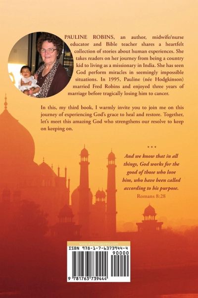 Pauline Robins, an author, midwife/nurse educator and Bible teacher shares a heartfelt collection of stories about human experiences. She takes readers on her journey from being a country kid to living as a missionary in India. She has seen God perform miracles in seemingly impossible situations. In 1995, Pauline (née Hodgkinson) married Fred Robins and enjoyed three years of marriage before tragically losing him to cancer. In this, my third book, I warmly invite you to join me on this journey of experiencing God's grace to heal and restore. Together, let's meet this amazing God who strengthens our resolve to keep on keeping on.