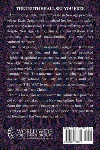 After finding herself fully immersed in New Age practices, author Karis Grace quickly realized her health and safety were taking a nosedive. Her family was suffering, as well. Despite New Age claims, rituals, and incantations that promised health and understanding, she was more confused than ever. Like most people, she desperately longed for truth and purpose in her life. And the movement promised heightened spiritual consciousness and peace. But sadly, New Age rituals only led to unbelievable torment and oppression while encountering paranormal energies and demonic forces. This movement was not bringing life but was robbing her daily life! That is until she discovered THE WAY to real life and purpose through the Good News of Jesus Christ. In this book, you will discover the counterfeit practices and concepts cloaked in the New Age culture. Learn more about the schemes the enemy uses to lure us into a life of deception and control. Read of one person's release from the bondage of the New Age way of life.