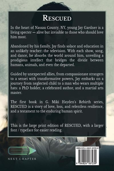 In the heart of Nassau County, NY, young Jay Gardner is a living specter - alive but invisible to those who should love him most. Abandoned by his family, Jay finds solace and education in an unlikely teacher: the television. With each show, song, and dance, he absorbs the world around him, unveiling a prodigious intellect that bridges the divide between humans, animals, and even the departed. Guided by unexpected allies, from compassionate strangers to a sensei with transformative powers, Jay embarks on a journey from neglected child to a man who wears multiple hats: a PhD holder, a celebrated author, and a martial arts master. The first book in G. Miki Hayden's Rebirth series, RESCUED is a story of love, loss, and relentless resilience, and a testament to the enduring human spirit. This is the large print edition of Rescued, with a larger font / typeface for easier reading.