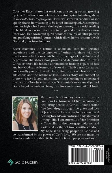 Courtney Kacer shares her testimony as a young woman growing up in a Christian household to an eventual spiral into drug abuse in Rescued: From Drugs to Jesus.Her story is written candidly, as she openly shares her yearning to be loved and accepted. As she grows into her high school years, she begins to recognize a void needing to be filled; as a result, she turns to drugs and grows further away from God. Her downward spiral becomes a source of introspection and purifying spiritual journey, which allows her to reconnect with God and grow from her past. Kacer examines the nature of addiction from her personal experience and the testimonies of others to share with you the factors which can contribute to feelings of loneliness and depression; she shares how prayer and determination to live a Christ-centered life has had a tremendous healing impact on her, and how God can redeem you of your sins. This is a transformative, emotionally powerful read, informing you on choices, pain, addictions, and the nature of love. Kacer's story will connect to those who have fought addiction, or those looking to understand the nature of love in a clear scope. She reminds us we are all part of God's Kingdon and can change our lives and re-commit to Christ. About the Author My name is Courtney Kacer. I live in Southern California, and I have a passion to help bring people to Christ.I have become free from drugs through the grace and love of Jesus Christ. I am active in my church and helping to lead women during bible study and through life. I am currently a Vice President - Controller in the mortgage industry, and a wife, and mother of two beautiful children. My hope is to bring people to Christ and be transformed by the power of God's love. We are not meant to wander aimlessly in this life, but to live it with purpose and joy.