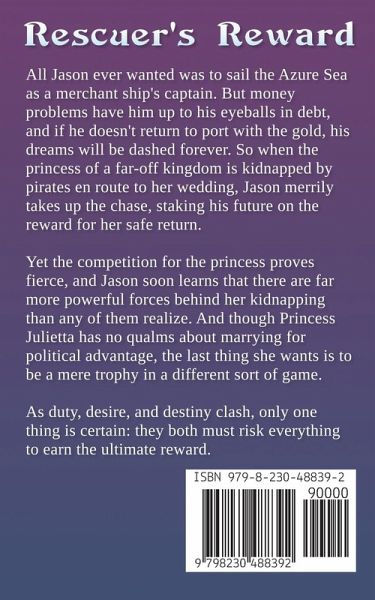 A captain in debt, a princess in peril, and a fate that neither can foresee. All Jason ever wanted was to sail the Azure Sea as a merchant ship's captain. But money problems have him up to his eyeballs in debt, and if he doesn't return to port with the gold, his dreams will be dashed forever. So when the princess of a far-off kingdom is kidnapped by pirates en route to her wedding, Jason merrily takes up the chase, staking his future on the reward for her safe return. Yet the competition for the princess proves fierce, and Jason soon learns that there are far more powerful forces behind her kidnapping than any of them realize. And though Princess Julietta has no qualms about marrying for political advantage, the last thing she wants is to be a mere trophy in a different sort of game. As duty, desire, and destiny clash, only one thing is certain: they both must risk everything to earn the ultimate reward.