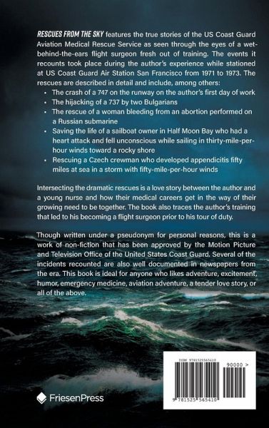 Rescues from the Sky features the true stories of the US Coast Guard Aviation Medical Rescue Service as seen through the eyes of a wet-behind-the-ears flight surgeon fresh out of training. The events it recounts took place during the author's experience while stationed at US Coast Guard Air Station San Francisco from 1971 to 1973. The rescues are described in detail and include, among others: - The crash of a 747 on the runway on the author's first day of work - The hijacking of a 737 by two Bulgarians - The rescue of a woman bleeding from an abortion performed on a Russian submarine - Saving the life of a sailboat owner in Half Moon Bay who had a heart attack and fell unconscious while sailing in thirty-mile-per-hour winds toward a rocky shore - Rescuing a Czech crewman who developed appendicitis fifty miles at sea in a storm with fifty-five mile-per-hour winds Intersecting the dramatic rescues is a love story between the author and a young nurse and how their medical careers get in the way of their growing need to be together. The book also traces the author's training that led to his becoming a flight surgeon prior to his tour of duty. Though written under a pseudonym for personal reasons, this is a work of non-fiction that has been approved by the Motion Picture and Television Office of the United States Coast Guard. Several of the incidents recounted are also well documented in newspapers from the era. This book is ideal for anyone who likes adventure, excitement, humor, emergency medicine, aviation adventure, a tender love story, or all of the above.
