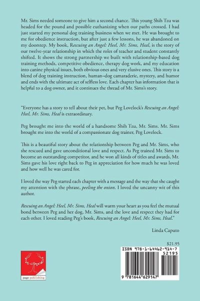 Mr. Sims needed someone to give him a second chance. This young Shih Tzu was headed for the pound and possible euthanizing when our paths crossed. I had just started my personal dog training business when we met. He was brought to me for obedience instruction, but after just a few lessons, he was abandoned on my doorstep. My book, Rescuing an Angel: Heel, Mr. Sims, Heal, is the story of our twelve-year relationship in which the roles of teacher and student constantly shifted. It shows the strong partnership we built with relationship-based dog training methods, competitive obedience, therapy dog work, and my education into canine physical issues, both obvious ones and very elusive ones. This story is a blend of dog training instruction, human-dog camaraderie, mystery, and humor and ends with the ultimate act of selfless love. Each chapter has information that is helpful to a dog owner, and it continues the thread of Mr. Sims's story. "Everyone has a story to tell about their pet, but Peg Lovelock's Rescuing an Angel: Heel, Mr. Sims, Heal is extraordinary. Peg brought me into the world of a handsome Shih Tzu, Mr. Sims. Mr. Sims brought me into the world of a compassionate dog trainer, Peg Lovelock. This is a beautiful story about the relationship between Peg and Mr. Sims, who she rescued and gave unconditional love and respect. As Peg trained Mr. Sims to become an outstanding competitor, and he won all kinds of titles and awards, Mr. Sims gave his love right back to Peg in appreciation for how much he was loved and how well he was cared for. I loved the way Peg started each chapter with a message and the way that she caught my attention with the phrase, peeling the onion. I loved the uncanny wit of this author. Rescuing an Angel: Heel, Mr. Sims, Heal will warm your heart as you feel the mutual bond between Peg and her dog, Mr. Sims, and the love and respect they had for each other. I loved reading Peg's book, Rescuing an Angel: Heel, Mr. Sims, Heal." Linda Caputo