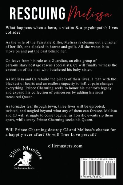 What happens when a hero, a victim & a psychopath's lives collide? Grab your copy of Rescuing Melissa to find out. "From the opening pages this story had me on the edge of my seat! The premise of this story could have been torn from a dozen different headlines yet the author found new spins at every corner." ~ Nerdy Dirty and Flirty "An intriguing mix of love story, action heroes, and whacked out freaks high on Girl Scout cookies - exactly my kind of book and highly recommended!" ~ Author Elise Noble Description: As the wife of the Fairytale Killer, Melissa is closing out a chapter of her life, one cloaked in horror and guilt. All she wants is to move on and put the past behind her. On leave from his role as a Guardian, an elite group of para-military hostage rescuse specialists, CJ will finally witness the execution of the man who butchered his baby sister. As Melissa and CJ rebuild the pieces of their lives, a man with the blackest of hearts and an endless capacity to inflict pain changes everything. Prince Charming seeks to honor his mentor's legacy and expand his collection of princesses by adding his most treasured Queen. As tornados tear through town, three lives will be uprooted, twisted, and tangled beyond what any of them can foresee. Melissa and CJ will struggle to come together as horrific events rip them apart, while Prince Charming seeks his Queen. Will Prince Charming destroy CJ and Melissa's chance for a happily ever after? Or will True Love win in the end? Grab your copy of Rescuing Melissa today and find out! What reviewers are saying: "Embodying the worst, and the best, of the human spirit, this author used a steady hand to produce a story that was, in the end, a testament to love and enduring strength. This was a 'stay up until 4 in the morning read' that was worth every minute of lost sleep..." ~ Nerdy Dirty and Flirty reviews. "From the first page to the last I was totally captivated. This fast-paced romantic suspense would not let me put it down. I had to know what would happen next." ~ Tamye from Books, Coffee and Crafts News "Who doesn't love a good fairy tale? Especially when it involves a serial killer whose victims are named after fairy tale princesses?? This book is an awesome romantic psychological thriller... There is action, lots of suspense, romance, and of course, not one but TWO psychopathic obsessive villains. If you are in the mood for a Cinderella meets Silence of the Lambs tale, this is your book!!!"