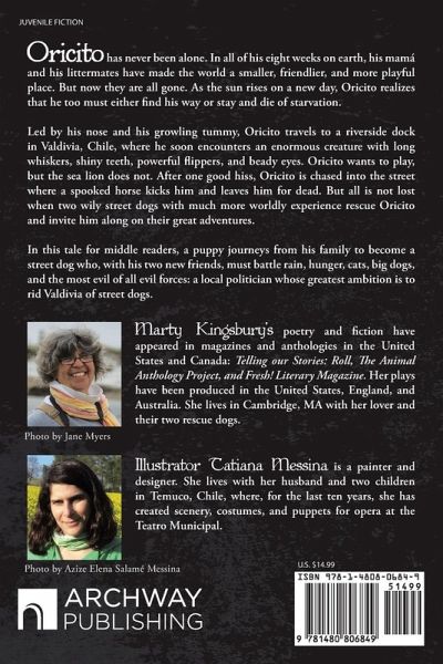 Oricito has never been alone. In all of his eight weeks on earth, his mamá and his littermates have made the world a smaller, friendlier, and more playful place. But now they are all gone. As the sun rises on a new day, Oricito realizes that he too must either find his way or stay and die of starvation. Led by his nose and his growling tummy, Oricito travels to a riverside dock in Valdivia, Chile, where he soon encounters an enormous creature with long whiskers, shiny teeth, powerful flippers, and beady eyes. Oricito wants to play, but the sea lion does not. After one good hiss, Oricito is chased into the street where a spooked horse kicks him and leaves him for dead. But all is not lost when two wily street dogs with much more worldly experience rescue Oricito and invite him along on their great adventures. In this tale for middle readers, a puppy journeys from his family to become a street dog who, with his two new friends, must battle rain, hunger, cats, big dogs, and the most evil of all evil forces: a local politician whose greatest ambition is to rid Valdivia of street dogs.