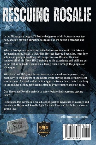 In the Nicaraguan jungle, I'll battle dangerous wildlife, treacherous terrain, and my growing attraction to Rosalie as we outrun a madman and survive. When a hostage rescue mission intended to save innocent lives takes a devastating turn, Hayes, a Guardian Hostage Rescue Specialist, leaps into action and plunges headlong into danger to save Rosalie. He must summon all of his Navy SEAL training as his experience and skill are put to the test as he leads Rosalie on a daring rescue through the jungles of Nicaragua. With lethal wildlife, treacherous terrain, and a madman in pursuit, they must survive the dangers of the jungle while staying ahead of their relentless pursuers. As sparks of attraction ignite between them, their lives hang in the balance as they race against time to evade capture and stay alive. Can Hayes and Rosalie make it to safety before their pursuers capture them? Experience this adrenaline-fueled, action-packed adventure of courage and romance as Hayes and Rosalie fight for their lives and battle for a chance at true love. "The Guardian Hostage Rescue series gets more intense with every book." ~ Susan from Goodreads Rescuing Rosalie is the fourth book in the exhilarating new BRAVO TEAM series. It's an angsty, steamy, romantic suspense read chock-full of edge-of-your-seat action, exciting adventure, and all the protective hero yummy goodness you can handle. It's hot, H-O-T... HOT! These former Navy SEALs, DELTA Operatives, and Special Ops soldiers turned Guardians & Protectors will capture your heart and leave you breathless. Heart-Stopping, Pulse-Pounding, Can't-Stop-Reading Romantic Suspense filled with Swoon-worthy, Passionate, and Protective Ex-Military Heroes. Download today-let HAYES and the Guardian Hostage Rescue Specialists restore your belief in modern-day heroes.