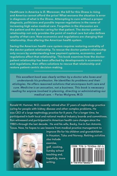 Healthcare in America is ill. Moreover, the bill for this illness is rising and America cannot afford the price! What worsens the situation is error in diagnosis of what is the illness. Attempting to cure without a proper diagnosis, politicians and pundits impose regulations in the name of increasing high value medical care. Forgotten in the discussion are the patient and the doctor caring for that patient. The doctor-patient relationship not only provides the point of medical care but also defines quality of that care. Now economics and regulations are changing that relationship, thus altering the American health system. Saving the American health care system requires restoring centrality of the doctor-patient relationship. To rescue the doctor-patient relationship only occurs by understanding how payment systems, economics, and regulations affect that relationship. This book examines how the doctor-patient relationship has been affected by developments in economics and regulations, then offers solutions to rescue that relationship and restore patient-centric decision-making.
