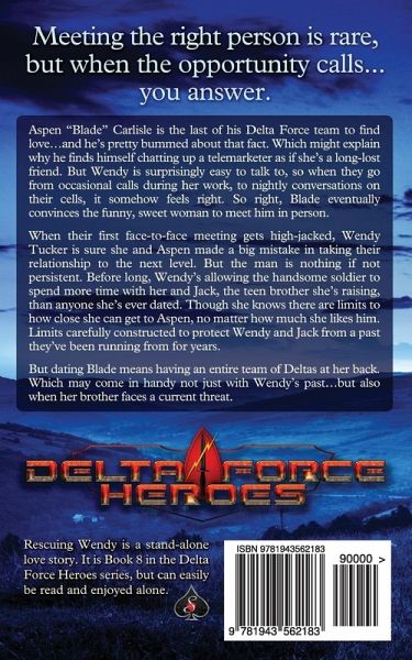 Aspen "Blade" Carlisle is the last of his Delta Force team to find love...and he's pretty bummed about that fact. Which might explain why he finds himself chatting up a telemarketer as if she's a long-lost friend. But Wendy is surprisingly easy to talk to, so when they go from occasional calls during her work, to nightly conversations on their cells, it somehow feels right. So right, Blade eventually convinces the funny, sweet woman to meet him in person. When their first face-to-face meeting gets high-jacked, Wendy Tucker is sure she and Aspen made a big mistake in taking their relationship to the next level. But the man is nothing if not persistent. Before long, Wendy's allowing the handsome soldier to spend more time with her and Jack, the teen brother she's raising, than anyone she's ever dated. Though she knows there are limits to how close she can get to Aspen, no matter how much she likes him. Limits carefully constructed to protect Wendy and Jack from a past they've been running from for years. But dating Blade means having an entire team of Deltas at her back. Which may come in handy not just with Wendy's past...but also when her brother faces a current threat.