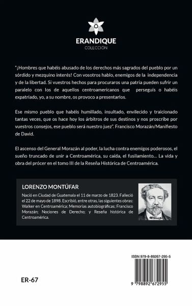 "¡Hombres que habéis abusado de los derechos más sagrados del pueblo por un sórdido y mezquino interés! Con vosotros hablo, enemigos de la independencia y de la libertad. Si vuestros hechos para procuraros una patria pueden sufrir un paralelo con los de aquellos centroamericanos que perseguís o habéis expatriado, yo, a su nombre, os provoco a presentarlos. Ese mismo pueblo que habéis humillado, insultado, envilecido y traicionado tantas veces, que os hace hoy los árbitros de sus destinos y nos proscribe por vuestros consejos, ese pueblo será nuestro juez". Francisco Morazán/Manifiesto de David.El ascenso del General Morazán al poder, la lucha contra enemigos poderosos, el sueño truncado de unir a Centroamérica, su caída, el fusilamiento... La vida y obra del prócer en el tomo III de la Reseña Histórica de Centroamérica.