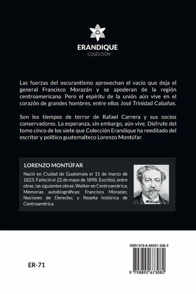 Las fuerzas del oscurantismo aprovechan el vacío que deja el general Francisco Morazán y se apoderan de la región centroamericana. Pero el espíritu de la unión aún vive en el corazón de grandes hombres, entre ellos José Trinidad Cabañas. Son los tiempos de terror de Rafael Carrera y sus socios conservadores. La esperanza, sin embargo, aún vive. Disfrute del tomo cinco de los siete que Colección Erandique ha reeditado del escritor y político guatemalteco Lorenzo Montúfar. Sobre el autor: LORENZO MONTÚFAR. Nació en Ciudad de Guatemala el 11 de marzo de 1823. Falleció el 22 de mayo de 1898. Escribió, entre otras, las siguientes obras: Walker en Centroamérica, Memorias autobiográficas, Francisco Morazán, Nociones de Derecho y Reseña histórica de Centroamérica.