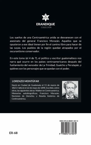Los sueños de una Centroamérica unida se desvanecen con el asesinato del general Francisco Morazán. Aquellos que se opusieron a ese ideal tienen por fin el camino libre para hacer de las suyas. Los pueblos de la región quedan atrapados por el oscurantismo conservador. En este tomo (el 4 de 7), el político y escritor guatemalteco nos narra qué ocurre en los países centroamericanos después del fusilamiento del vencedor de La Trinidad, Gualcho y Perulapán, y quiénes son los personajes que se quedan con el poder. Sobre el autor: LORENZO MONTÚFAR. Nació en Ciudad de Guatemala el 11 de marzo de 1823. Falleció el 22 de mayo de 1898. Escribió, entre otras, las siguientes obras: Walker en Centroamérica, Memorias autobiográficas, Francisco Morazán, Nociones de Derecho y Reseña histórica de Centroamérica.