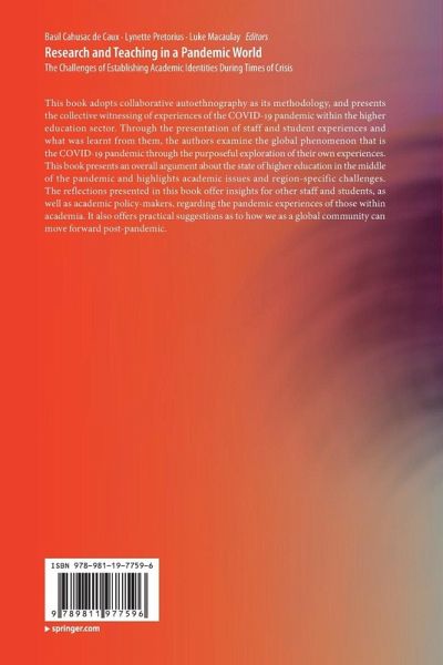 An Introduction to Research and Teaching in a Post-Pandemic World.- PREFACE Research and Teaching in a Post-Pandemic World.- CHAPTER 1 Introduction to the COVID-19 Pandemic and its Impact on Higher Education.- CHAPTER 2 A Harmony of Voices: The Value of Collaborative Autoethnography as Collective Witnessing during a Pandemic.- Academic Identity Development amidst Pandemic-induced Loss, Trauma, and Grief.- CHAPTER 3 Processing Uncertainty During COVID-19: A Collaborative Autoethnography of Two Stranded International PhD Students.- CHAPTER 4 Balancing Growth and Grief: Narratives of an Immigrant Doctoral Student Navigating Academia during the COVID-19 Pandemic.- CHAPTER 5 Rediscovering Myself through Fear of Failure: My Journey as an International Doctoral Student during a Pandemic.- CHAPTER 6 My PhD Saved My Sanity and My Life.- Locality and Internationality in Shaping Academic Identities during a Pandemic.- CHAPTER 7 "Locked Down, But Inspired": Beginning Our ResearchStudies During COVID-19.- CHAPTER 8 Establishing Academic Identities through Professional Socialisation during the COVID-19 Pandemic: A Doctoral Student, Institutional Member, or Early Career Researcher?.- CHAPTER 9 An International Student, a Researcher, or a Work-ready Graduate? Exploring the Self-Formation of International Students in Coursework Master's Programmes.- CHAPTER 10 Adaptation of Environmental and Sustainability Education During the COVID-19 Pandemic.- Resilience and Growth - Features of Academic Identity Development during a Pandemic.- CHAPTER 11 Hajime! ! Karate as Academic Salvation.- CHAPTER 12 Uncertainty and Autism: How Changing with the Times is Harder for Some.- CHAPTER 13 Academic Motherhood in Times of Pandemic: Finding Silver Linings.- CHAPTER 14 Lockdown, Online Learning, and Sense of Coherence: How I Managed to Finish My Master's Degree During the COVID-19 Pandemic.- CHAPTER 15 Cognitive Hardiness in the Face of Uncertainty: PhD-ing From HomeDuring a Global Pandemic.- CHAPTER 16 Mitigating the Challenges of Thesis Writing during the COVID-19 Pandemic: An Autoethnographic Reflection of Two Doctoral Students' Perezhivanie.- CHAPTER 17 PhD Candidature During the Pandemic: Hansel and Gretel's Trip Through the Woods.- CHAPTER 18 Empowerment in the Crisis: Narratives of COVID-19 Generation Researchers.- CHAPTER 19 Turning Crisis into Opportunities: New Insights for Academic Experiences During the Pandemic Inspired from a Cultural-Historical and Activity Theory Perspective in an Autoethnography.- CHAPTER 20 A Shift in Doctoral Students' Demands and Motives During the COVID-19 Pandemic.- CHAPTER 21 Entering a Career as an ECR in an Increasingly Shifting Academic Landscape: The Value of Different Forms of Capital.- CHAPTER 22 The Kitchen Table: Mother-Academics Reconfiguring their Emerging Identities While Aligning Family and Work.- Doing Research in Times of Change - Methodological Ethnographies of Coping.- CHAPTER 23 The Effects of the Pandemic on the Research Output and Strategies of Early Career Researchers and Doctoral Candidates.- CHAPTER 24 (Dis)embodied Learning: Centring the Body and Emotions in Online Professional Learning.- CHAPTER 25 Leveraging Zoom Video-Conferencing Features in Interview Data Generation during the Covid-19 Pandemic.- CHAPTER 26 Pixelated Participation: A PhD Student's Notes of Online Data Generation During the COVID-19 Pandemic.- CHAPTER 27 The Unforgotten Pre-Service Teachers [Participants]: Did the Pandemic Affect Learning While on Practicum? What Uncompleted Pre-Service Teachers' Mentoring Experiences [Data] Can Tell Us.- CHAPTER 28 The Impact of COVID-19 on PhD Research: An Autoethnographic Account by an International Student in Melbourne.- Supporting Academic Identity Development during a Global Crisis.- CHAPTER 29 ''Memeing It Up!": Doctoral Students' Reflections of Collegiate Virtual Writing Spaces during the COVID-19 Pandemic.- CHAPTER 30 'Intertext' in a NewContext: Lessons Learnt from Collaborating, Contributing, and Connecting Through an Online Interdisciplinary Student-Led Symposium During COVID-19.- CHAPTER 31 "Let's Talk About Wellbeing!": Fostering Interdependence in Doctoral Communities.- CHAPTER 32 Tackling a Sense of Insecurity: Enhancing Digital Literacy as a Call to Action for Educators during the Pandemic.- CHAPTER 33 Education and ICT amidst the COVID-19 Pandemic: Teaching Reflections of Indonesian Educators.- CHAPTER 34 Reflections on Developing Academic Identity during the Pandemic.- CODA The Challenges of Establishing Academic Identities During Times of Change.