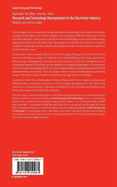Technologies such as renewable energy alternatives including wind, solar and biomass, storage technologies and electric engines are creating a different landscape for the electricity industry. Using sources and ideas from technologies such as renewable energy alternatives, Research and Technology Management in the Electricity Industry explores a different landscape for this industry and applies it to the electric industry supported by real industry cases.