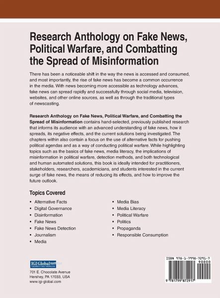 With recent headlines around fake news from world leaders and around presidential elections, Twitter and other social media platforms being pressured to detect and label misinformation posted on their platforms, as well as misinformation around COVID-19 and its vaccine, the world has seen an increase in protests, policy changes, and even chaos surrounding this information. This spread of misinformation, when left unchecked, can turn fiction into fact and result in a mass misconception of the truth that shapes opinions, creates false narratives, and impacts multiple facets of society in potentially detrimental ways, indicating a need for the latest research on how the devastating impacts of this trend, how to discern facts from misinformation, as well as more information on technological advancements in fake news detection The Research Anthology on Fake News, Political Warfare, and Combatting the Spread of Misinformation is a compilation of the most comprehensive, previously published, and highly cited research from prestigious institutions including Columbia University and Stanford University, USA, which focuses on understanding fake news, how it spreads, its negative effects, and current solutions being investigated. While highlighting topics such as fake news, trending conspiracy theories, media distrust, political warfare, and detection methods, this book is ideally intended for practitioners, stakeholders, researchers, academicians, and students interested in the continuing surge of fake news and its, at times, dangerous results.