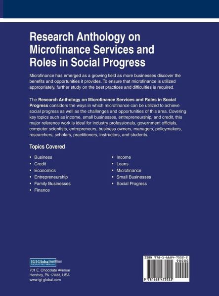 Microfinance has emerged as a growing field as more businesses discover the benefits and opportunities it provides. To ensure that microfinance is utilized appropriately, further study on the best practices and difficulties is required. The Research Anthology on Microfinance Services and Roles in Social Progress considers the ways in which microfinance can be utilized to achieve social progress as well as the challenges and opportunities of this area. Covering key topics such as income, small businesses, entrepreneurship, and credit, this major reference work is ideal for industry professionals, government officials, computer scientists, entrepreneurs, business owners, managers, policymakers, researchers, scholars, practitioners, instructors, and students.