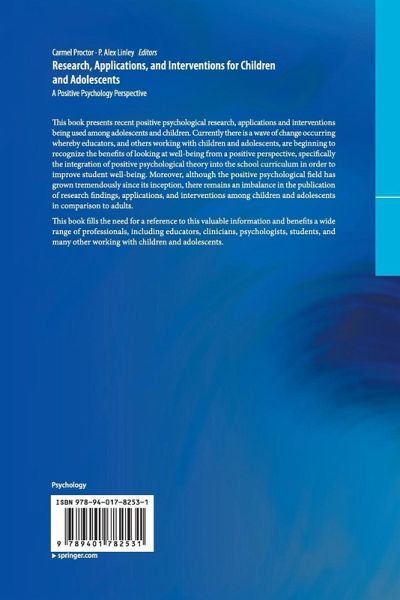 This book presents recent positive psychological research, applications and interventions being used among adolescents and children. Currently there is a wave of change occurring whereby educators, and others working with children and adolescents, are beginning to recognize the benefits of looking at well-being from a positive perspective, specifically the integration of positive psychological theory into the school curriculum in order to improve student well-being. Moreover, although the positive psychological field has grown tremendously since its inception, there remains an imbalance in the publication of research findings, applications, and interventions among children and adolescents in comparison to adults.