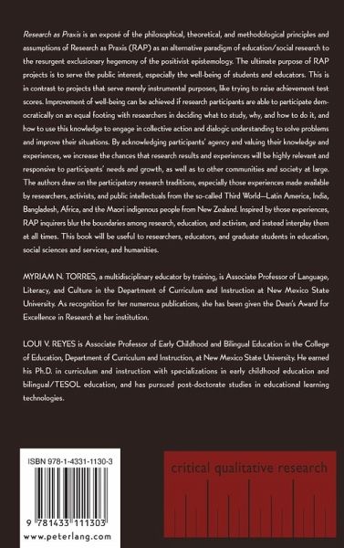 «In 'Research as Praxis: Democratizing education epistemologies', Torres and Reyes offer a beautifully written and intellectually well-grounded challenge to researchers: To critically examine how power relations permeate our research, who benefits from our work, and ultimately whose voice matters. Rooted in a clear vision of freedom and participatory democracy, Research as Praxis, lucidly articulates an alternative to positivism. This book should be required reading in all education doctoral programs.» (Christine Sleeter, PhD, Professor Emerita, California State University Monterey Bay)