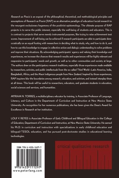 «In 'Research as Praxis: Democratizing education epistemologies', Torres and Reyes offer a beautifully written and intellectually well-grounded challenge to researchers: To critically examine how power relations permeate our research, who benefits from our work, and ultimately whose voice matters. Rooted in a clear vision of freedom and participatory democracy, Research as Praxis, lucidly articulates an alternative to positivism. This book should be required reading in all education doctoral programs.» (Christine Sleeter, PhD, Professor Emerita, California State University Monterey Bay)