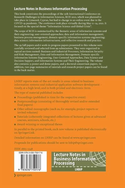 This book constitutes the proceedings of the 15th International Conference on Research Challenges in Information Sciences, RCIS 2021, which was planned to take place in Limassol, Cyprus, but had to change to an online event due to the COVID-19 pandemic. The conference took place virtually during May 11-14, 2021. It focused on the special theme "Information Science and Global Crisis".