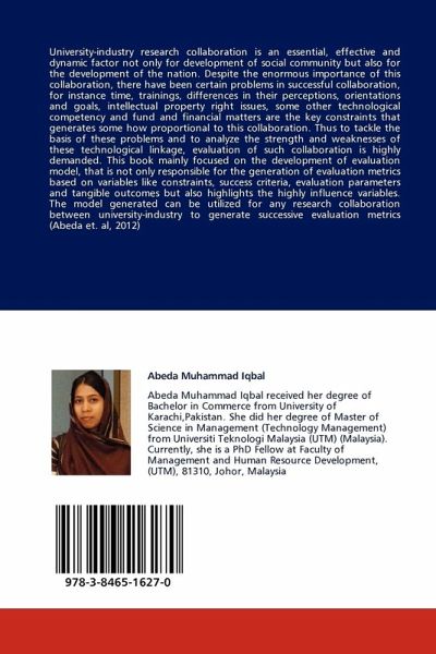 University-industry research collaboration is an essential, effective and dynamic factor not only for development of social community but also for the development of the nation. Despite the enormous importance of this collaboration, there have been certain problems in successful collaboration, for instance time, trainings, differences in their perceptions, orientations and goals, intellectual property right issues, some other technological competency and fund and financial matters are the key constraints that generates some how proportional to this collaboration. Thus to tackle the basis of these problems and to analyze the strength and weaknesses of these technological linkage, evaluation of such collaboration is highly demanded. This book mainly focused on the development of evaluation model, that is not only responsible for the generation of evaluation metrics based on variables like constraints, success criteria, evaluation parameters and tangible outcomes but also highlightsthe highly influence variables. The model generated can be utilized for any research collaboration between university-industry to generate successive evaluation metrics (Abeda et. al, 2012)