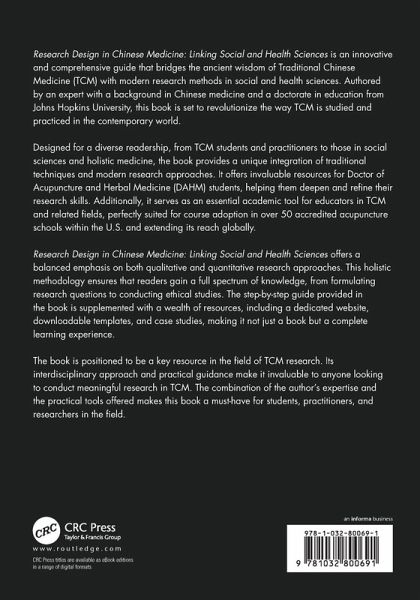 Research Design in Chinese Medicine: Linking Social and Health Sciences is an innovative and comprehensive guide that bridges the ancient wisdom of Traditional Chinese Medicine (TCM) with modern research methods in social and health sciences. Authored by an expert with a background in Chinese medicine and a doctorate in education from Johns Hopkins University, this book is set to revolutionize the way TCM is studied and practiced in the contemporary world.