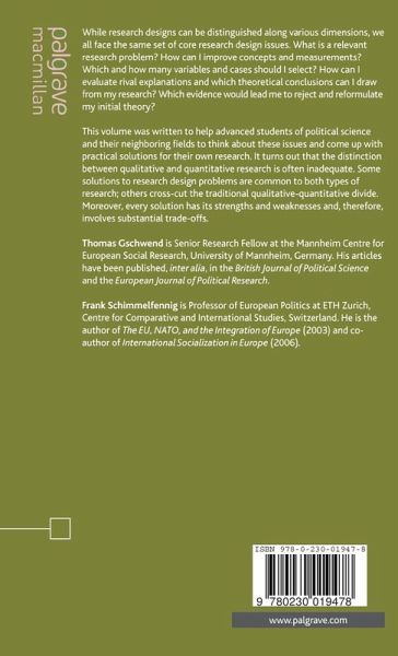 Designing Research in Political Science; T.Gschwend & F.Schimmelfennig Increasing the Relevance of Research Questions; M.Lehnert, B.Miller & A.Wonka Concept Specification in Political Science Research; A.Wonka Typologies in Social Inquiry; M.Lehnert Making Measures Capture Concepts; B.Miller Achieving Comparability of Secondary Data; J.Rathke Dealing Effectively with Selection Bias in Large-n Research; J.Thiem Case Selection and Selection Bias in Small-n Research; D.Leuffen Selecting Independent Variables; U.Sieberer Discriminating among Rival Explanations: Some Tools for Small-n Researchers; A.Dür Falsification in Theory-Guided Empirical Social Research; D.De Bièvre Lessons for the Dialogue between Theory and Data; T.Gschwend & F.Schimmelfennig