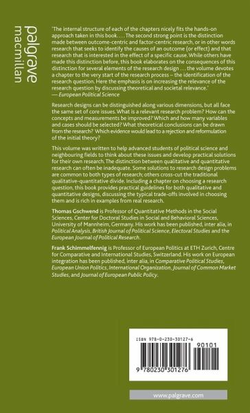 Designing Research in Political Science; T.Gschwend & F.Schimmelfennig Increasing the Relevance of Research Questions; M.Lehnert, B.Miller & A.Wonka Concept Specification in Political Science Research; A.Wonka Typologies in Social Inquiry; M.Lehnert Making Measures Capture Concepts; B.Miller Achieving Comparability of Secondary Data; J.Rathke Dealing Effectively with Selection Bias in Large-n Research; J.Thiem Case Selection and Selection Bias in Small-n Research; D.Leuffen Selecting Independent Variables; U.Sieberer Discriminating among Rival Explanations: Some Tools for Small-n Researchers; A.Dür Falsification in Theory-Guided Empirical Social Research; D.De Bièvre Lessons for the Dialogue between Theory and Data; T.Gschwend & F.Schimmelfennig