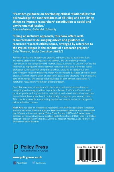 Research Ethics in the Real World highlights the links between research ethics and individual, social, professional, institutional, and political ethics. Helen Kara considers all stages of the research process and provides guidance for quantitative, qualitative, and mixed-methods researchers about how to act ethically throughout.