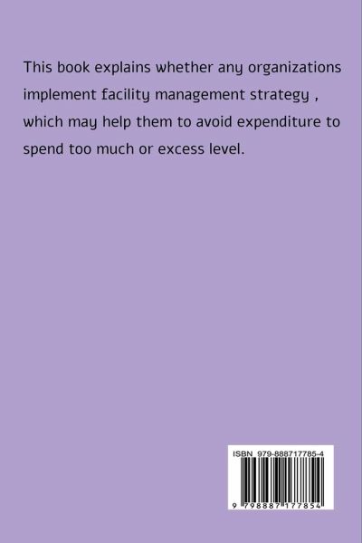 This book explains whether any organizations implement facility management strategy , which may help them to avoid expenditure to spend too much or excess level. If the organization does implement ( FM ) facility management strategy how and why it will increase expenditure in its organization. Readers can learn FM strategy whether it can help any organizations to bring long term expenditure reducing economic benefits.